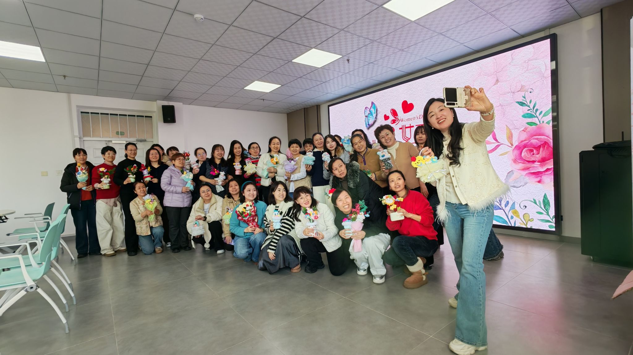 活动现场暖意融融、氛围热烈,大家一边亲切交流,一边分享教学中的趣事、生活中的感悟,欢声笑语不断回荡在活动现场,既有动手创作的乐趣,也有相聚的温情。经过一番精心创作,一个个花篮、一束束花束相继诞生,每一件作品都承载着女教师们的巧思与心意,凝聚着对生活的热爱与对幸福的期许。老师们手捧自己的作品,相互欣赏、拍照留念,脸上洋溢着满满的成就感与幸福感,定格下属于这个节日的美好瞬间。